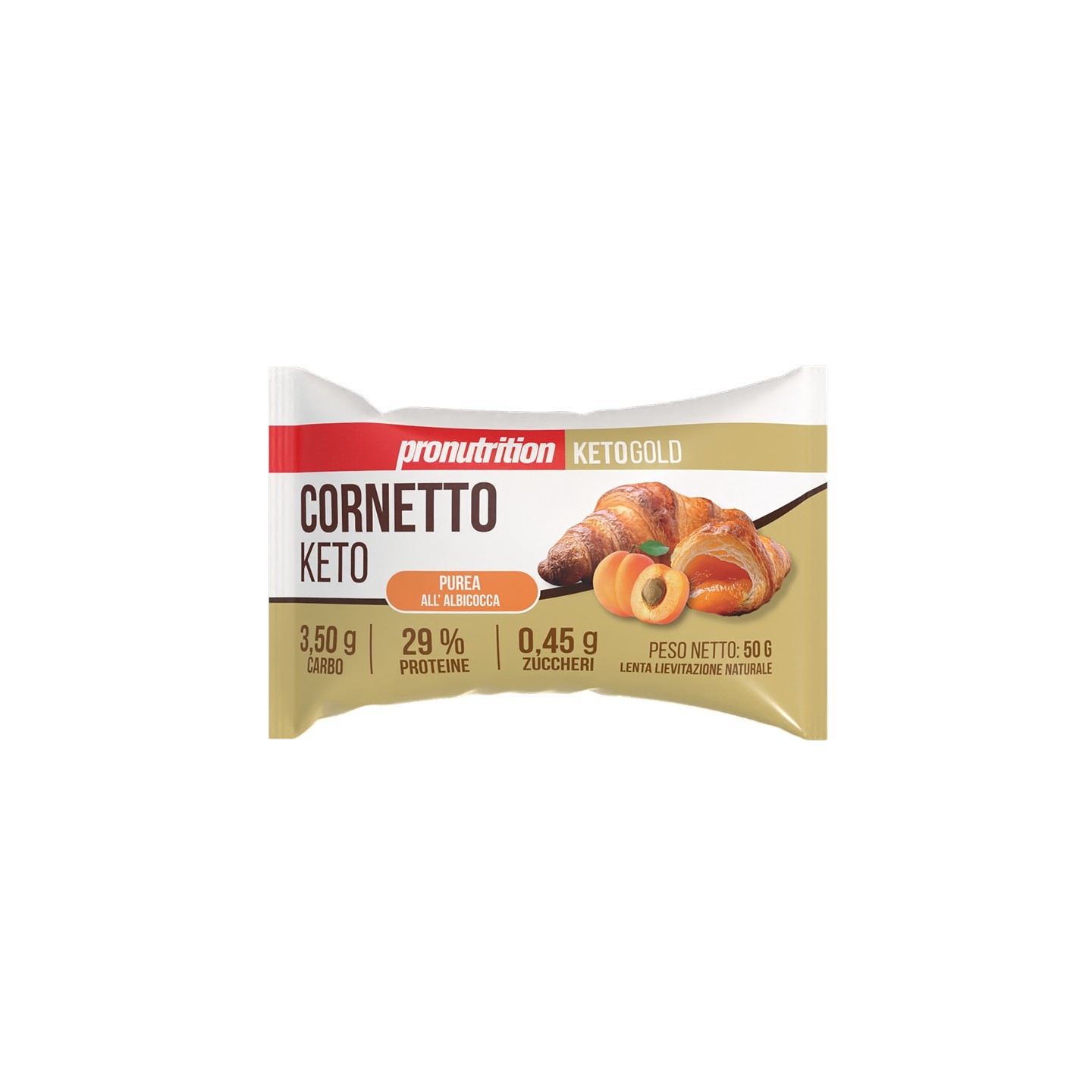 Delizioso cornetto chetogenico ripieno di una purea all'albicocca. I laboratori pasticceri di Pronutrition hanno compiuto un vero e proprio miracolo culinario realizzando un cornetto con un gusto ed una fragranza tale e quale al cornetto del bar, ma comunque in perfetto stile cheto a bassissimo tenore di carboidrati e con un ripieno di crema all'albicocca deliziosa, avvolgente e gustosa. La qualità delle materie prime, le nuove tecnologie, ma soprattutto l'esclusività della ricetta chetogenica rende il cornetto Pronutrition un vero e proprio piacere per il palato senza perdere di vista la tabella nutrizionale dove gli zuccheri e i carboidrati sono ai minimi termini.